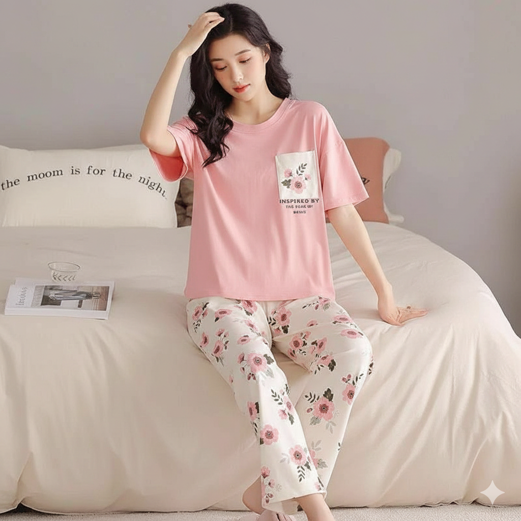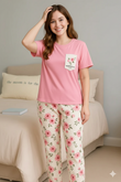 Soft Pink Graphic T-Shirt with Pattern Bottoms For Women Night Wear lower